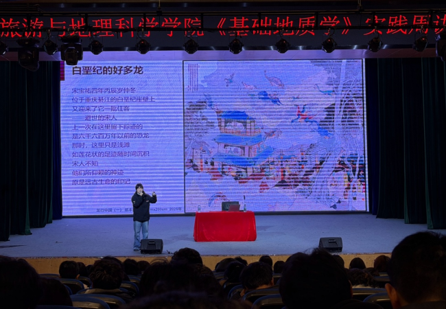 本网讯(图、文/向婉丽)为激发新生专业兴趣、拓宽跨学科创新视野,2025年11月25日下午,由基础地质学授课教师乔恒忠、向婉丽共同策划组织的一场别开生面的兴趣导向讲座在多功能厅成功举办。本次活动特邀成都理工大学王夏副研究员与永利官网优秀校友、四川省诗书画院专职画家罗婧文老师联袂开讲(见图1),为地理科学、人文地理与城乡规划专业的大一新生带来一场融合理性与感性的思维盛宴。
